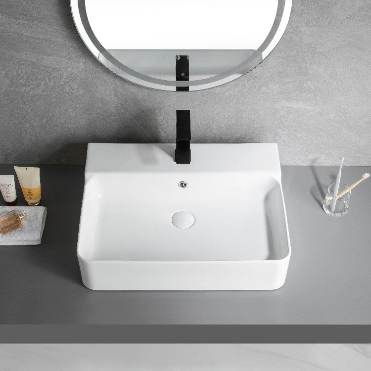 - Diseño montado en la parte superior: Este lavabo de cerámica al por mayor tiene un método único de montaje superior, estable y fiable. Ahorra espacio, cumple con la sensación moderna en el cuarto de baño, y se adapta a varios estilos de decoración.