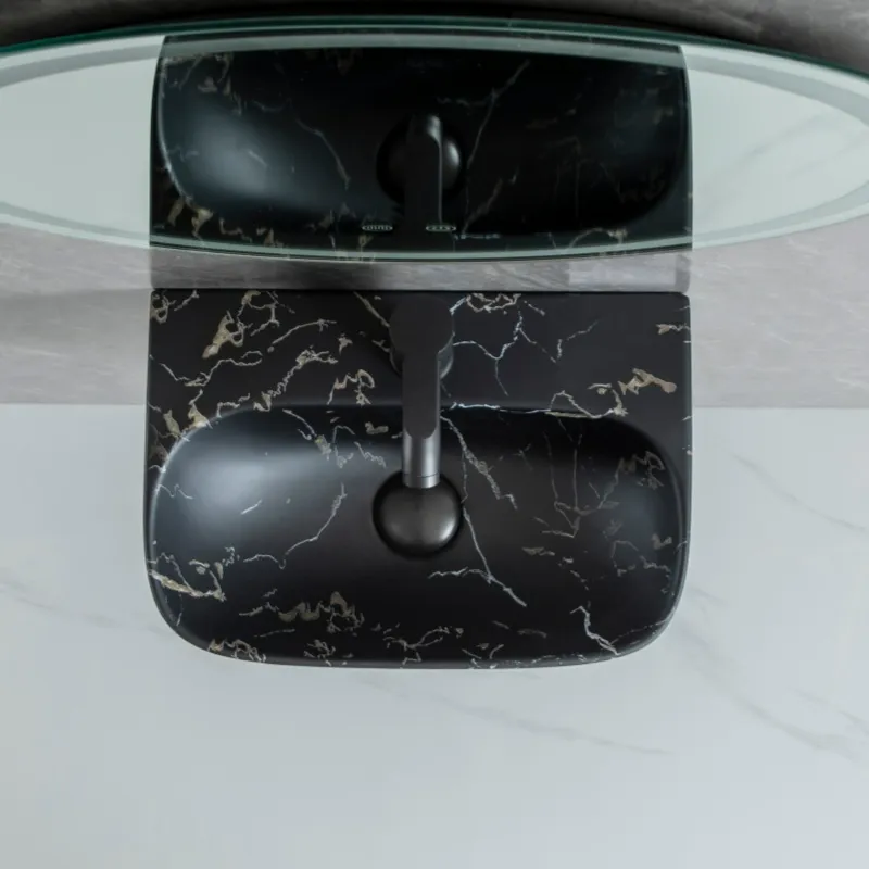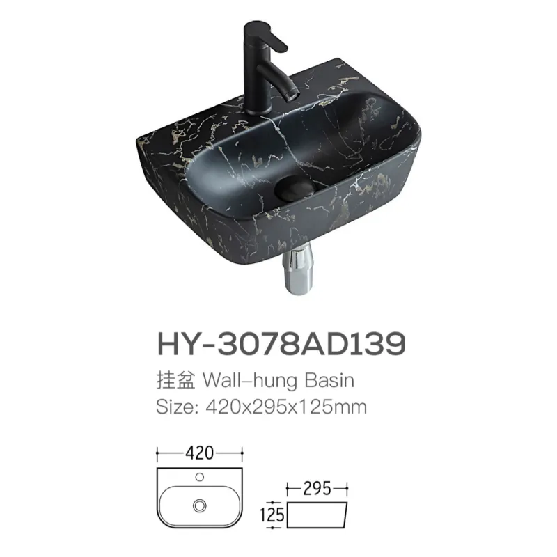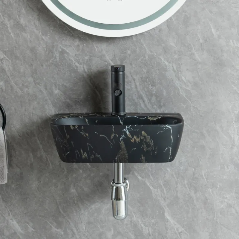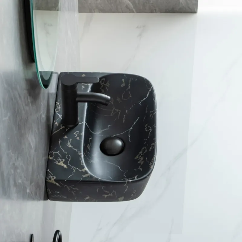 Welcome to purchase bathroom sinks. This wall mount sink wholesale combines a sophisticated matte black color with a realistic marble texture. Its contemporary, minimalistic design will upgrade any commercial or residential space with a modern aesthetic.