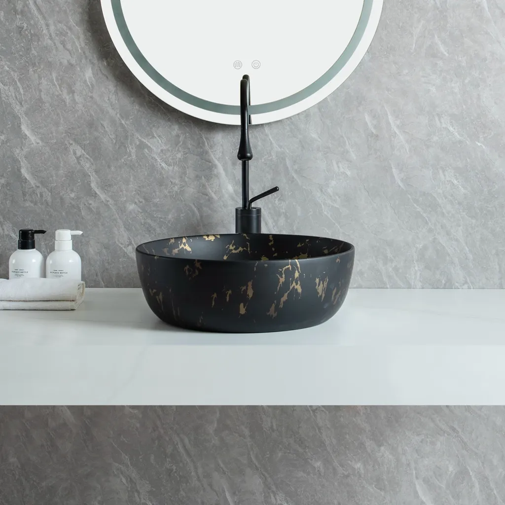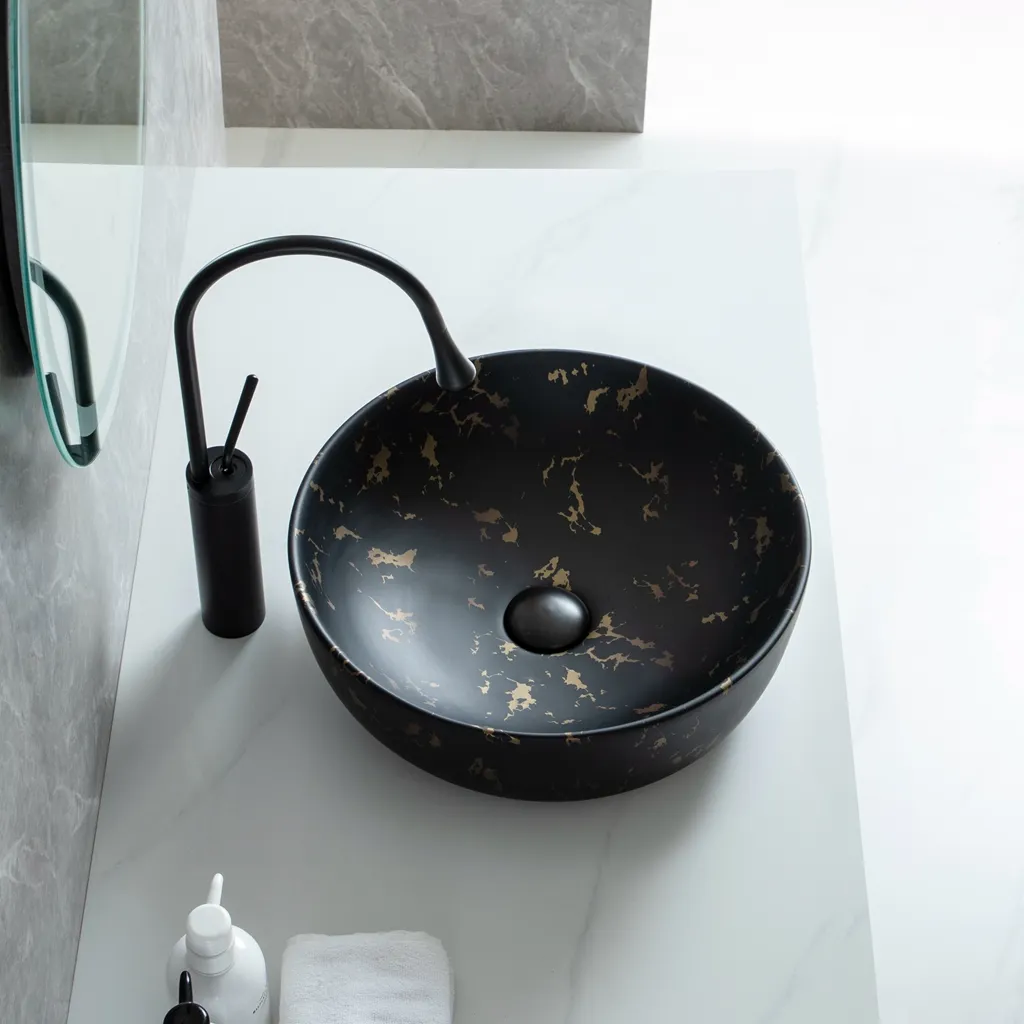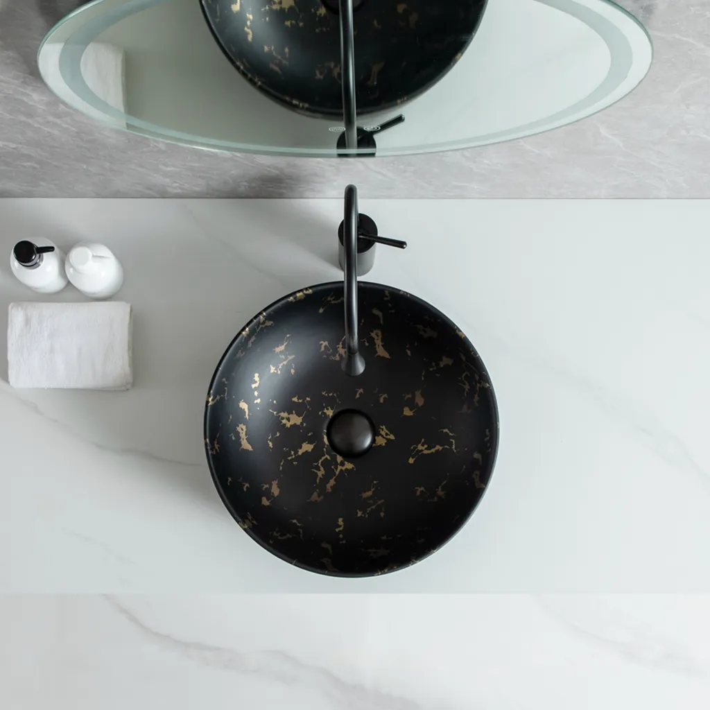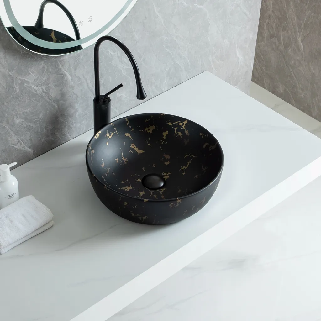 Welcome to purchase ceramic art basins. Luxury 415mm wholesale bathroom round sink with stunning black and gold marble finish. Durable ceramic vessel sink for high-end hotel and modern vanity projects.