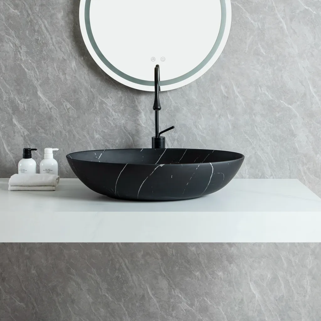Welcome to purchase ceramic bathroom sinks. Our premium 650mm wholesale oval ceramic basin with sleek black marble finish. Durable, easy-to-clean countertop art basin for modern luxury bathroom projects.