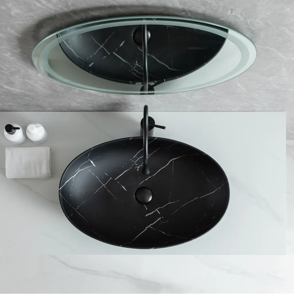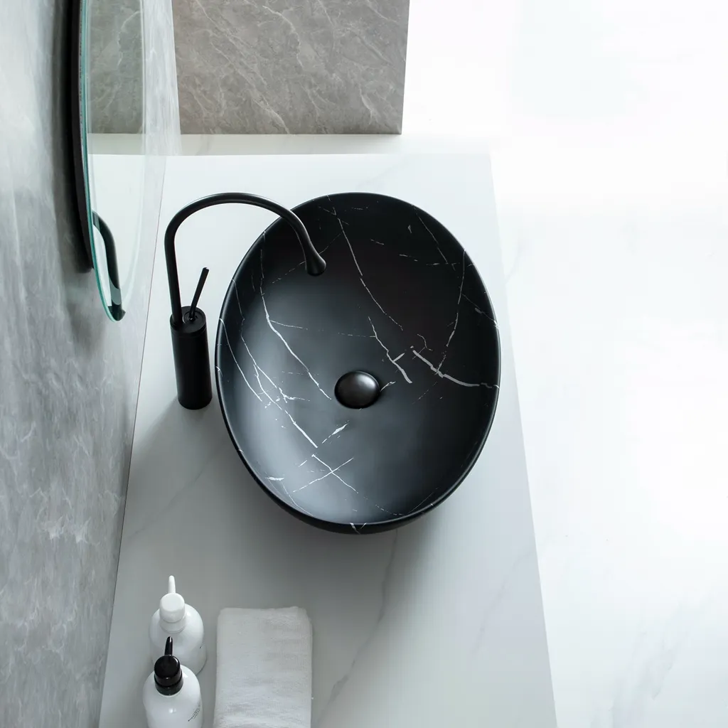 • Premium Marble-Effect Design: This wholesale oval ceramic basin features a unique marble texture with a black base and white veining. It elevates the sense of luxury in any bathroom, making it the premier choice for modern, “light luxury” interior styles.