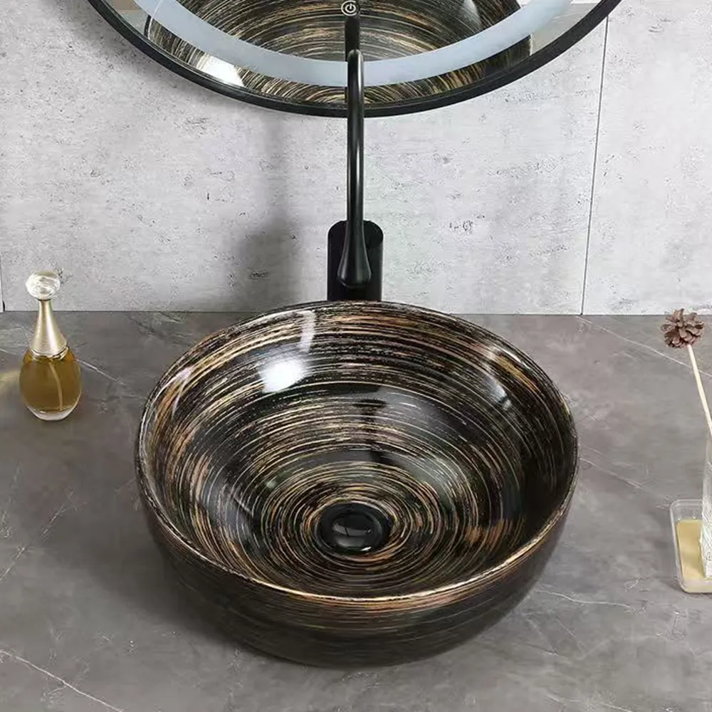 Welcome to order wholesale round bathroom sinks. These custom pattern ceramic wash basins combine a deep black background with a luxurious gold swirling pattern, and offer flexible customization options for patterns and sizes.