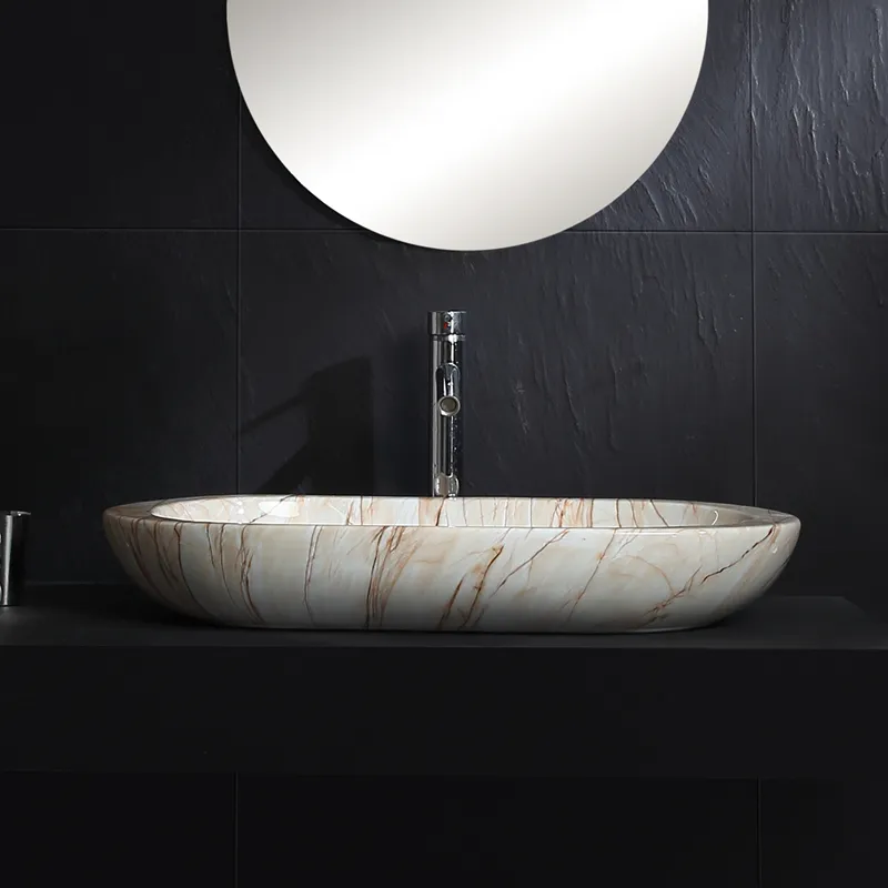 Welcome to purchase custom ceramic bathroom sinks. This shallow wholesale bathroom sink adopts realistic marble texture design, with natural and elegant appearance, suitable for modern simple and light luxury bathroom space. Support customization, widely used in residential, commercial space and wholesale and retail channels.