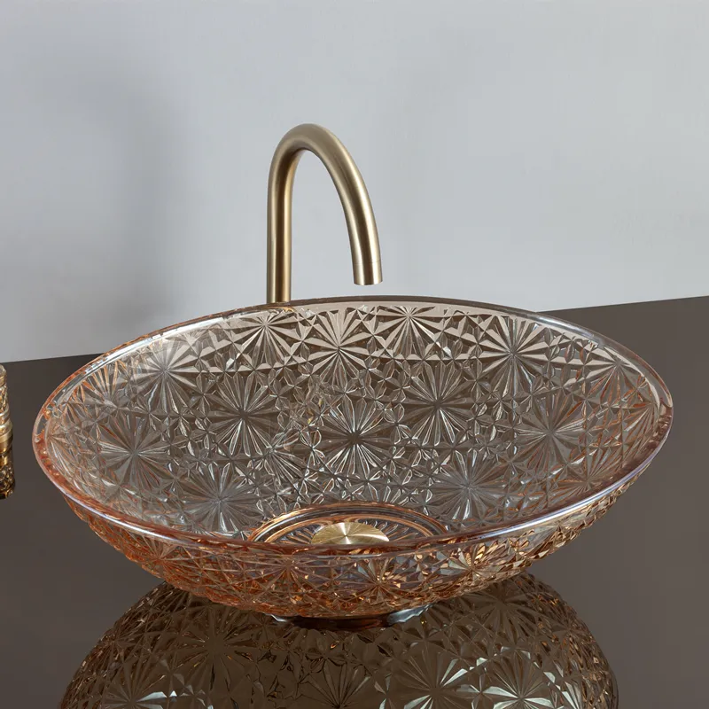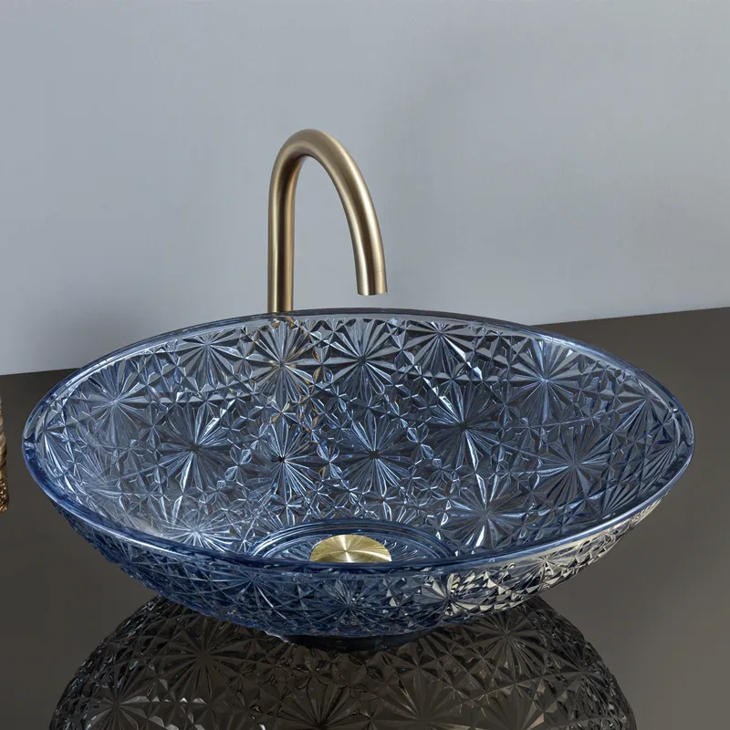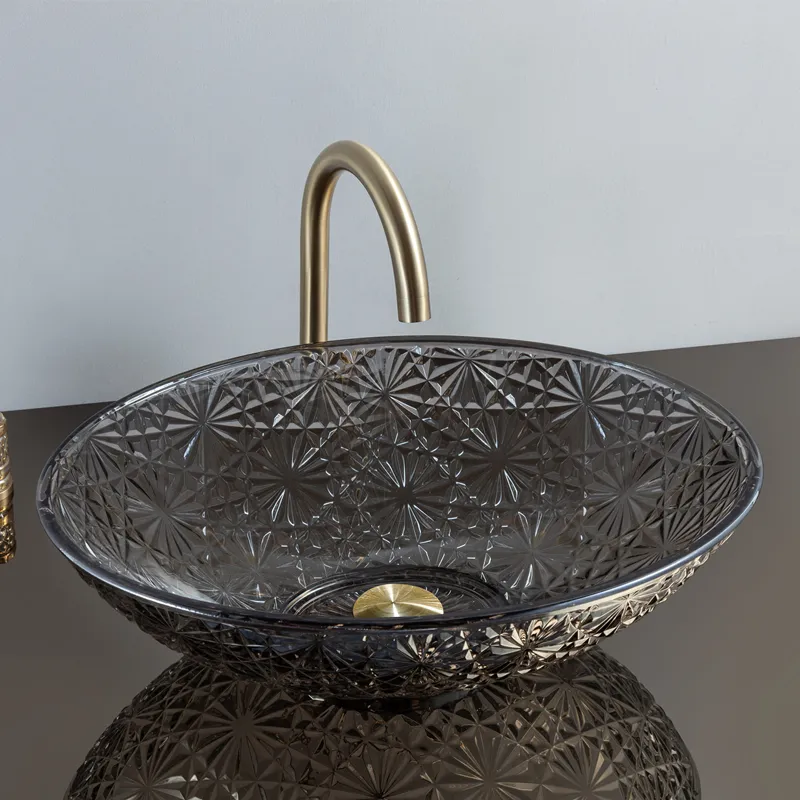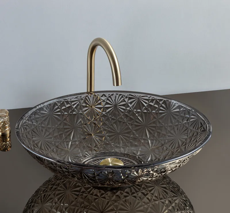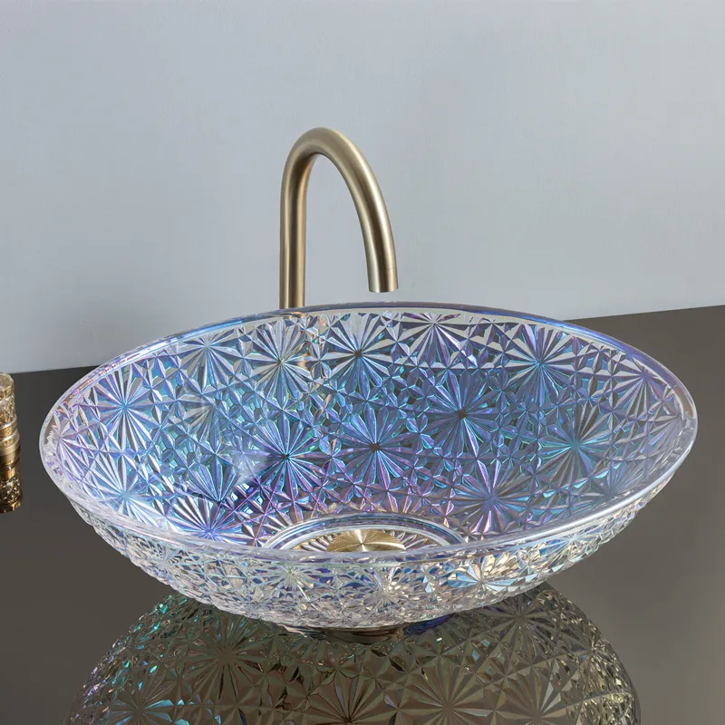 Welcome to purchase wholesale bathroom glass sinks. Made with high-quality glass and meticulously crafted, these sinks feature exquisite starburst, geometric, and other cut or printed patterns on the surface, and are available in a variety of colors.