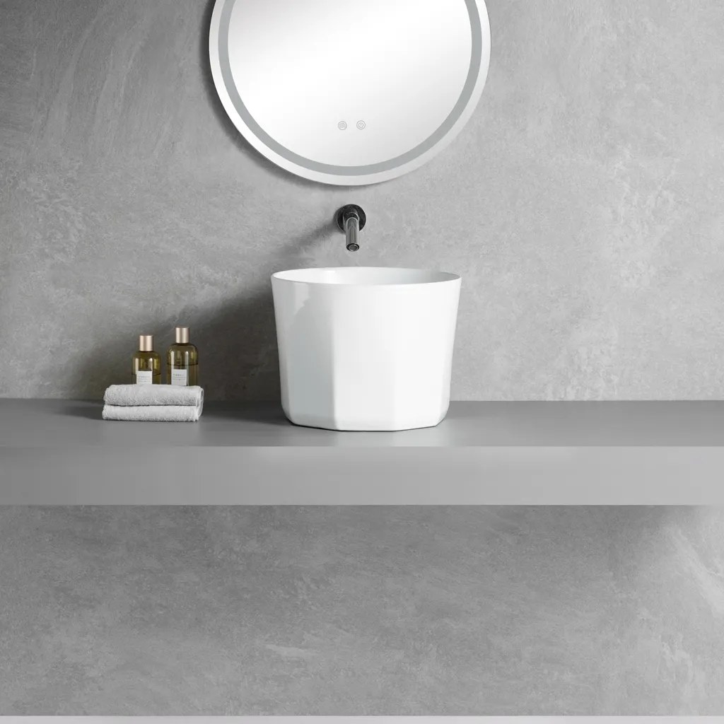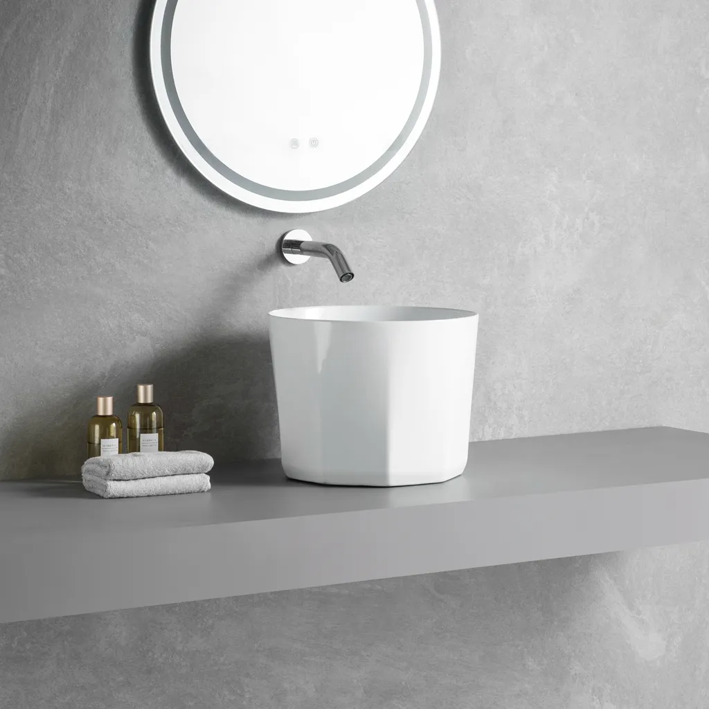 - Instalação fácil: Concebidos para montagem acima do balcão, estes lavatórios de casa de banho por atacado são fáceis de instalar, oferecendo uma solução sem complicações tanto para novas construções como para renovações de casas de banho.