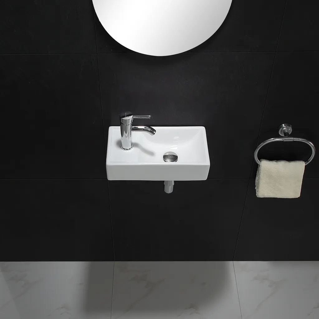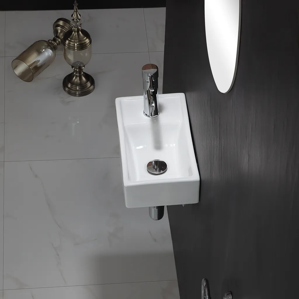 - Высококачественный керамический материал: Our custom small wall mounted sink in bulk is made of high-quality ceramic raw materials and fired at high temperatures to ensure that the product is durable, smooth, easy to clean and maintain, and maintains long-lasting beauty.